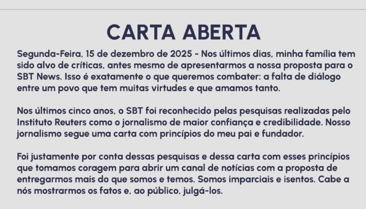 Na carta, Daniela afirma que, nos últimos dias, sua família e a emissora têm sido alvo de críticas, muitas delas antes mesmo de o público conhecer a proposta do novo canal de notícias. Segundo ela, a situação evidencia justamente o que o SBT pretende combater: a falta de diálogo e os julgamentos precipitados.