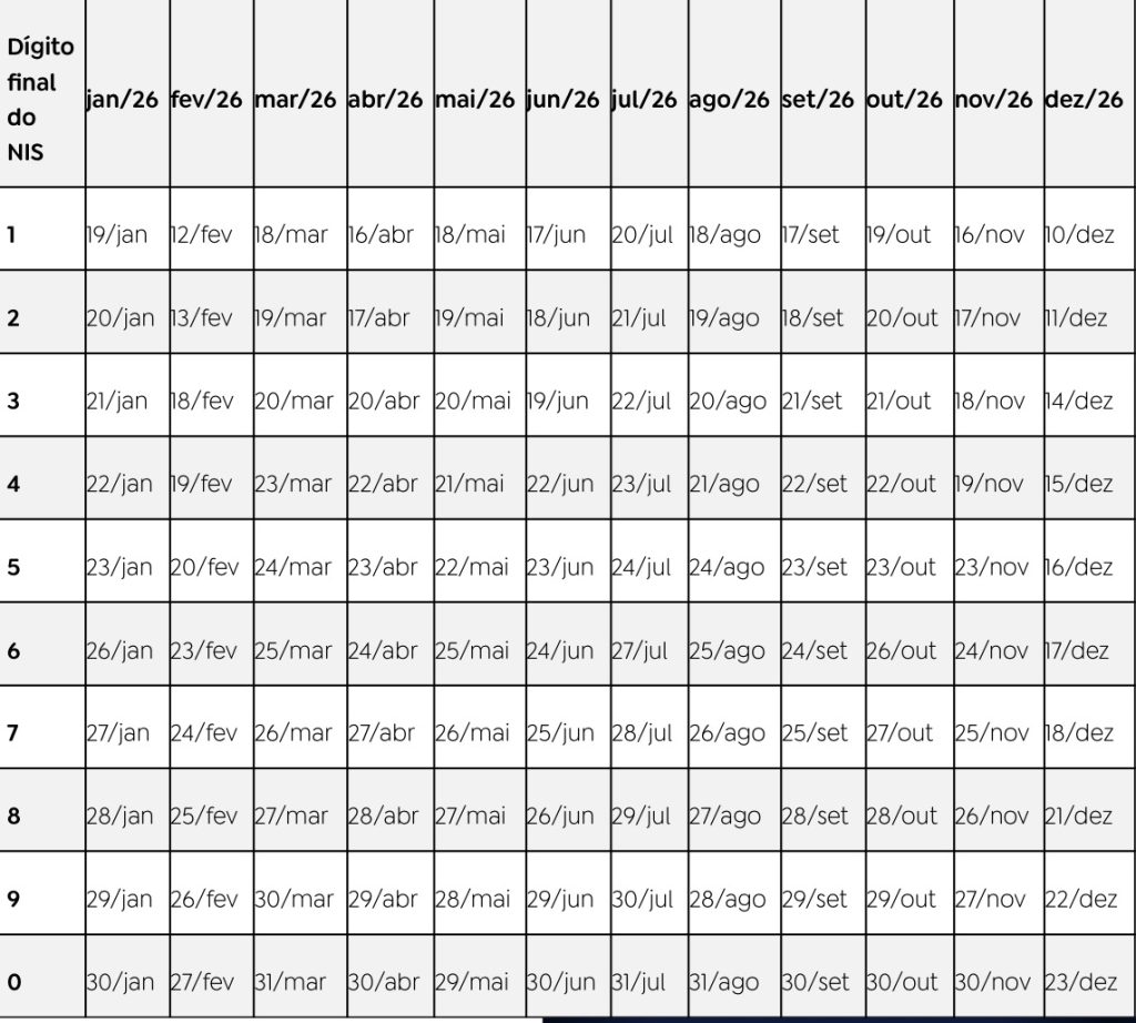 Os pagamentos ocorrerão nos últimos dez dias úteis de cada mês, de forma escalonada conforme o dígito final do Número de Inscrição Social (NIS), exceto em dezembro, quando o cronograma é antecipado em cerca de uma semana por causa do Natal.