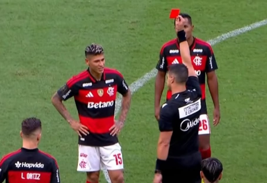 Após a paralisação e já no retorno do intervalo, o árbitro Rafael Rodrigo Klein reavaliou o lance e decidiu pela expulsão direta do atleta rubro-negro, aplicando o cartão vermelho a Carrascal.