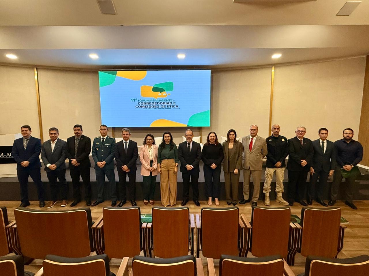 Corregedoras, corregedores e presidentes de conselhos de ética de diversas instituições públicas do Estado, na 11ª Reunião do Fórum Permanente de Corregedorias e Comissões de Ética com atuação no Estado do Acre.