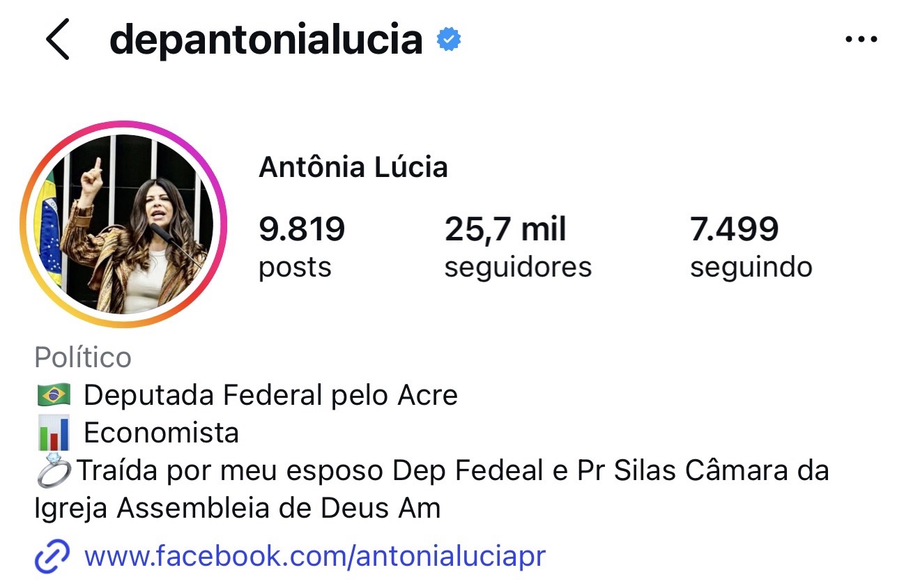 A deputada federal Antônia Lúcia Câmara (Republicanos) surpreendeu seguidores ao utilizar a própria biografia do Instagram para divulgar que teria sido traída, além de fazer uma publicação que rapidamente gerou repercussão nas redes sociais. A mensagem, escrita pela parlamentar, expõe detalhes pessoais do relacionamento e cita o marido, Alex, engenheiro que, segundo ela, deixou o Acre para atuar em projetos ligados a emendas parlamentares.