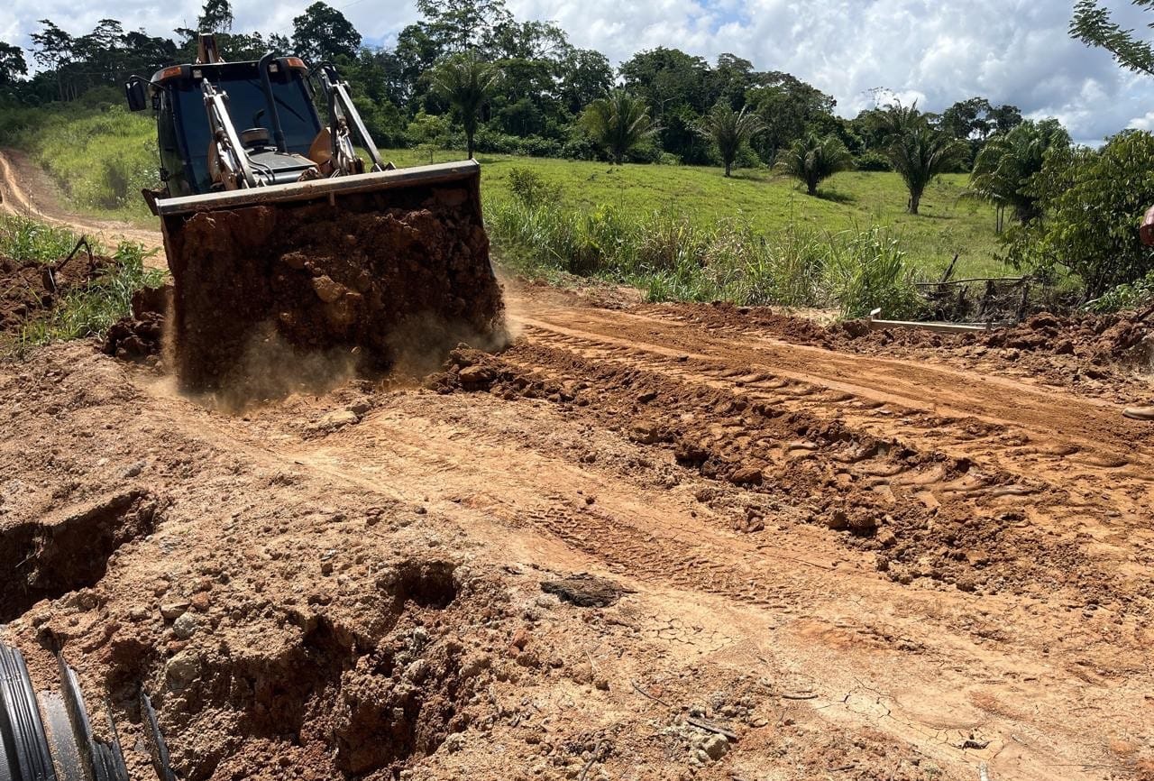 Um dos pontos atendidos é o Ramal do Antimary, onde as equipes executaram serviços emergenciais após erosão provocada pelo alto volume de chuvas. No local, foi realizada a implantação de tubo em Pead (polietileno de alta densidade) para restabelecer a drenagem e conter o avanço dos danos na estrada. Além da drenagem, os trabalhos incluem retirada de atoleiros, raspagem de solo e liberação de trechos comprometidos, garantindo a passagem de veículos e o acesso das famílias que utilizam o ramal.