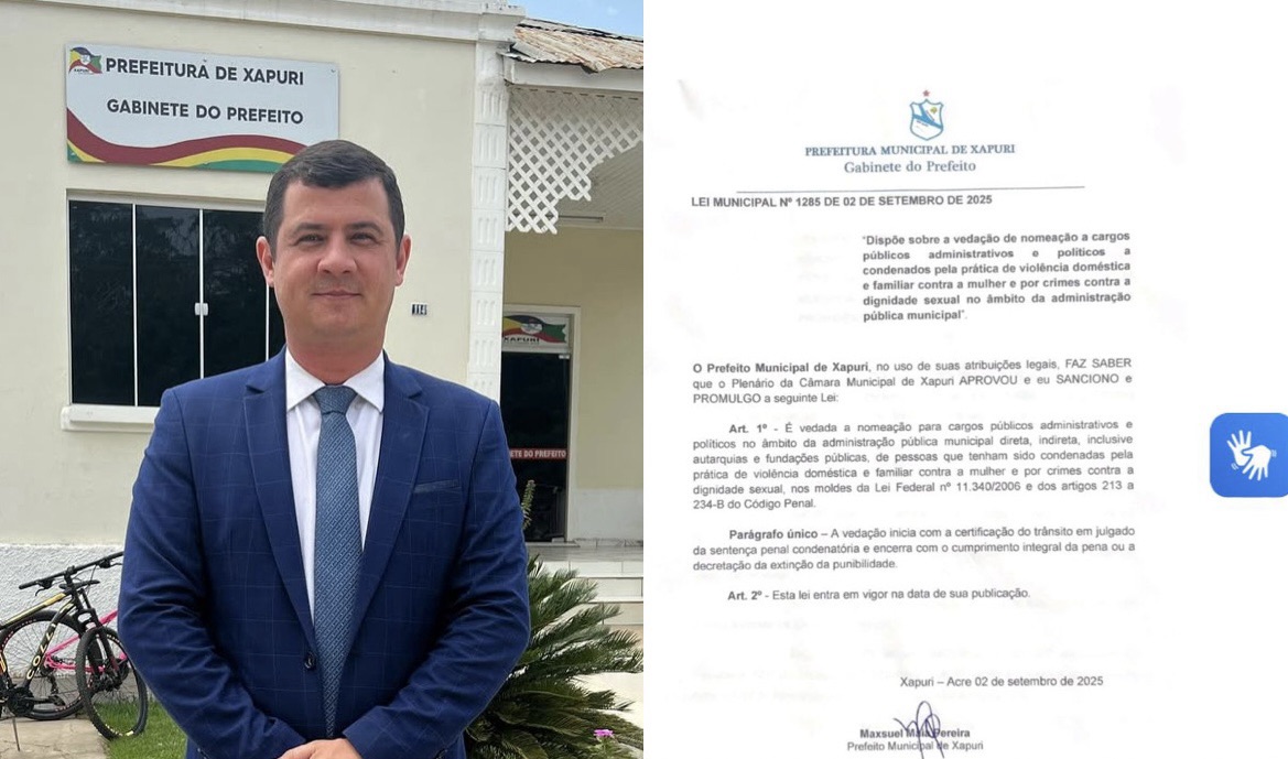 Em setembro de 2025, prefeito de Xapuri sancionou lei que proíbe nomeação de condenados por violência contra mulher