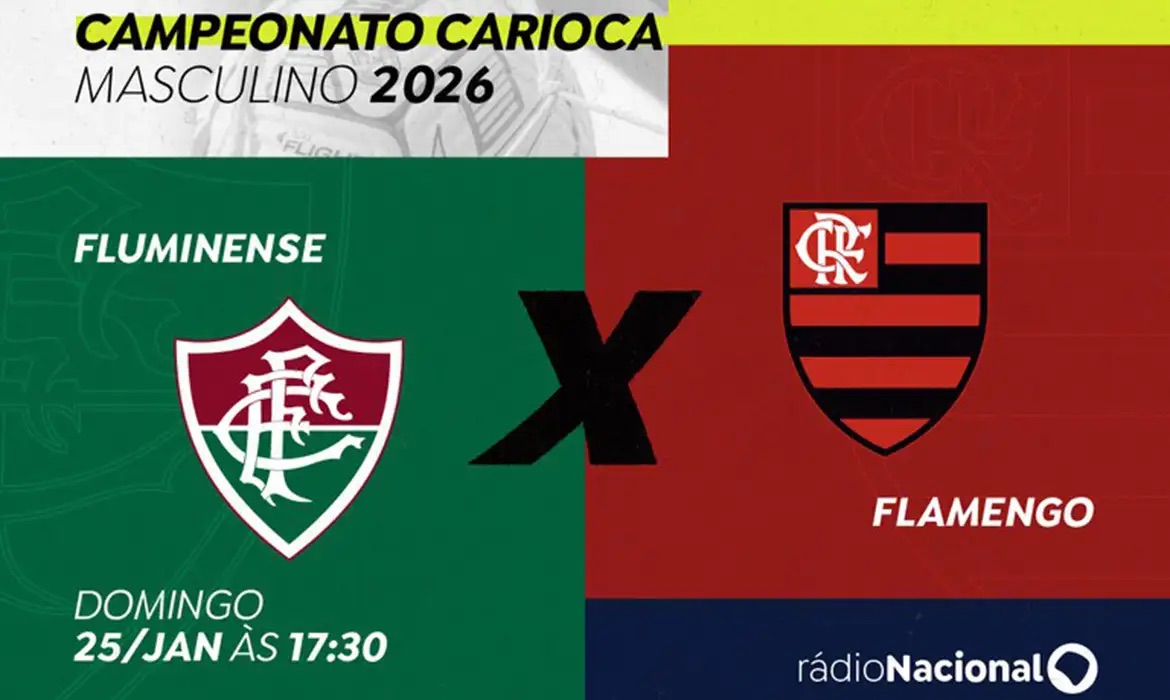 A Rádio Nacional transmite neste domingo, 25, o primeiro Fla-Flu do ano pelo Campeonato Carioca 2026. A jornada esportiva para o clássico entre Fluminense e Flamengo começa às 17h30, com a bola rolando às 18h, direto do estádio do Maracanã, no Rio de Janeiro.
