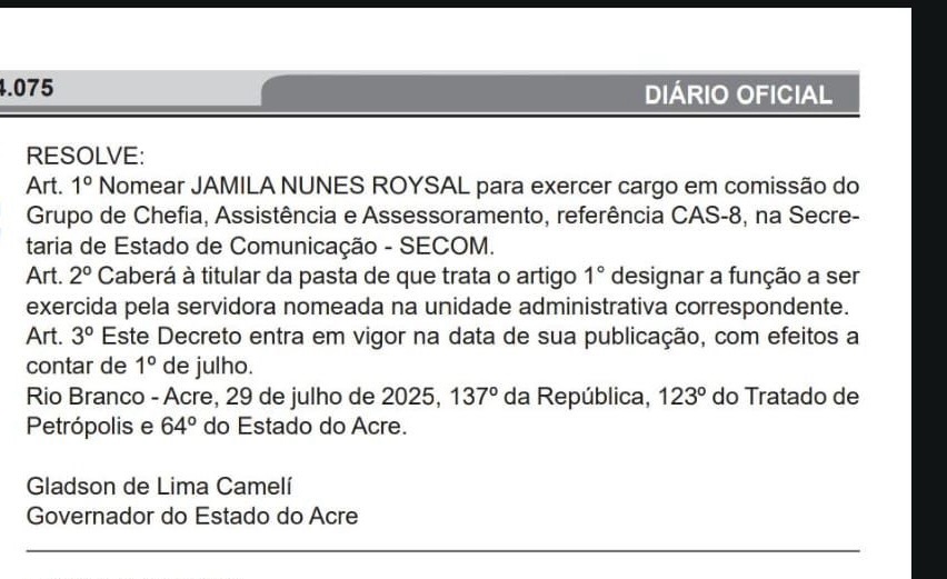 Jamila foi nomeada para um cargo em comissão de referência CAS-8 na Secretaria de Estado de Comunicação (Secom). A admissão consta como iniciada em 1º de julho de 2025, conforme decreto publicado no Diário Oficial no dia 29 do mesmo mês, com previsão de pagamento retroativo. O salário mensal é de aproximadamente R$ 12,7 mil.
