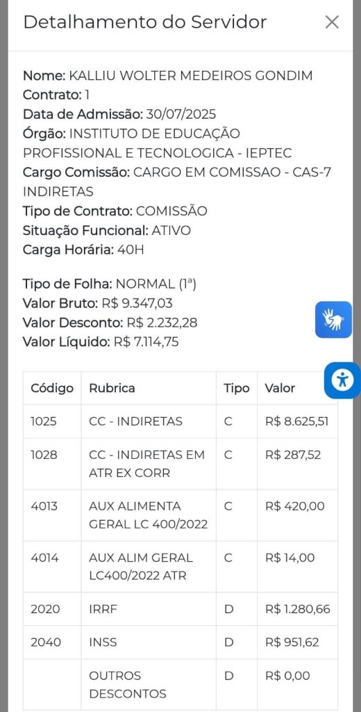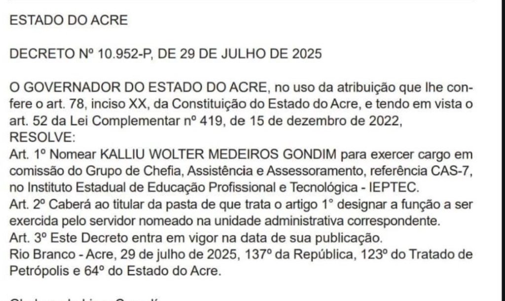 Já Kalliu Wolter passou a integrar o quadro do Instituto Estadual de Educação Profissional e Tecnológica (Ieptec), ocupando um cargo comissionado de referência CAS-7. A nomeação ocorreu em 30 de julho de 2025, com decreto publicado na mesma data, e remuneração mensal em torno de R$ 9,3 mil.