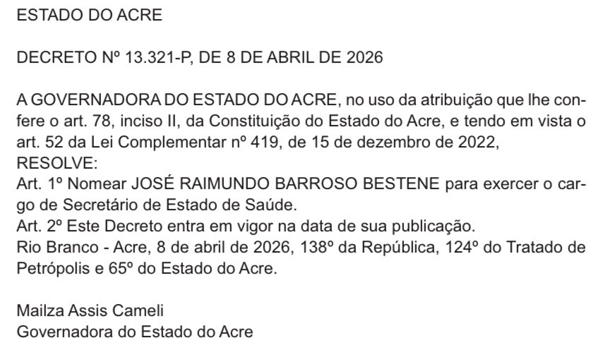 Com a publicação, Bestene passa a assumir oficialmente a condução da Secretaria de Saúde, uma das pastas mais estratégicas da administração estadual, responsável pela gestão do sistema público de saúde, execução de políticas sanitárias e coordenação de serviços essenciais à população.