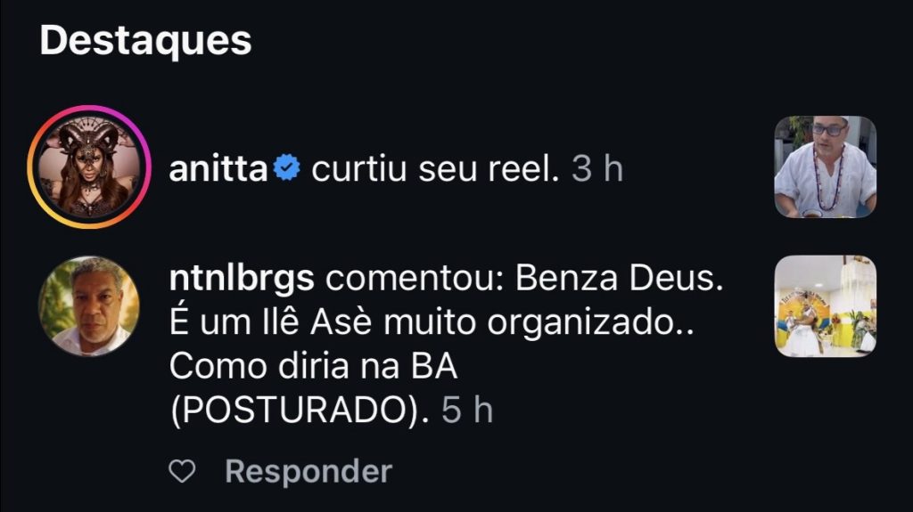 A repercussão chegou também ao meio artístico. A cantora Anitta, que é adepta de religiões de matriz africana, está entre as personalidades que curtiram e interagiram com os conteúdos, ajudando a impulsionar a visibilidade do trabalho desenvolvido por Germano nas redes sociais.