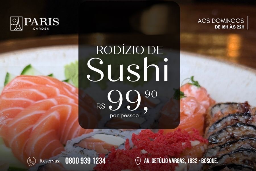 Neste domingo (22), o Paris Garden conta com uma opção gastronômica voltada aos amantes da culinária japonesa. Excepcionalmente para este domingo, o restaurante oferece rodízio de sushi, no horário das 18h às 22h, pelo valor de R$ 99,90 por pessoa.