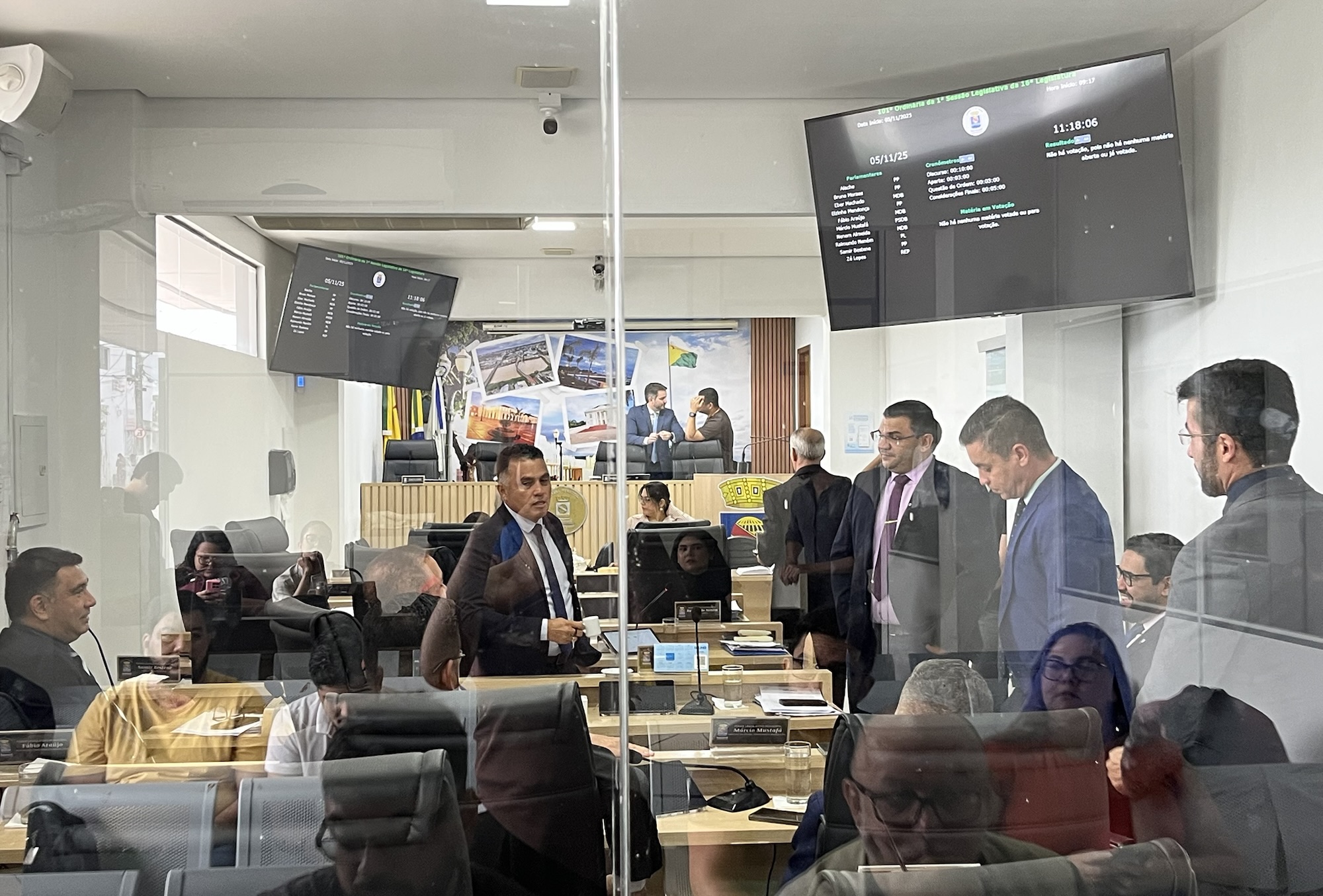 No plenário, alguns vereadores foram vistos conversando e circulando pelo local, mas os trabalhos legislativos não começaram oficialmente no horário previsto pelo regimento interno, 08h30.