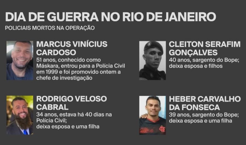 Quatro policiais, dois civis e dois militares, morreram na última terça-feira (28) durante a megaoperação das forças de segurança nos complexos da Penha e do Alemão, na Zona Norte do Rio de Janeiro. A ação, que mobilizou cerca de 2.500 agentes, integra a Operação Contenção e já é considerada a mais letal da história do estado.