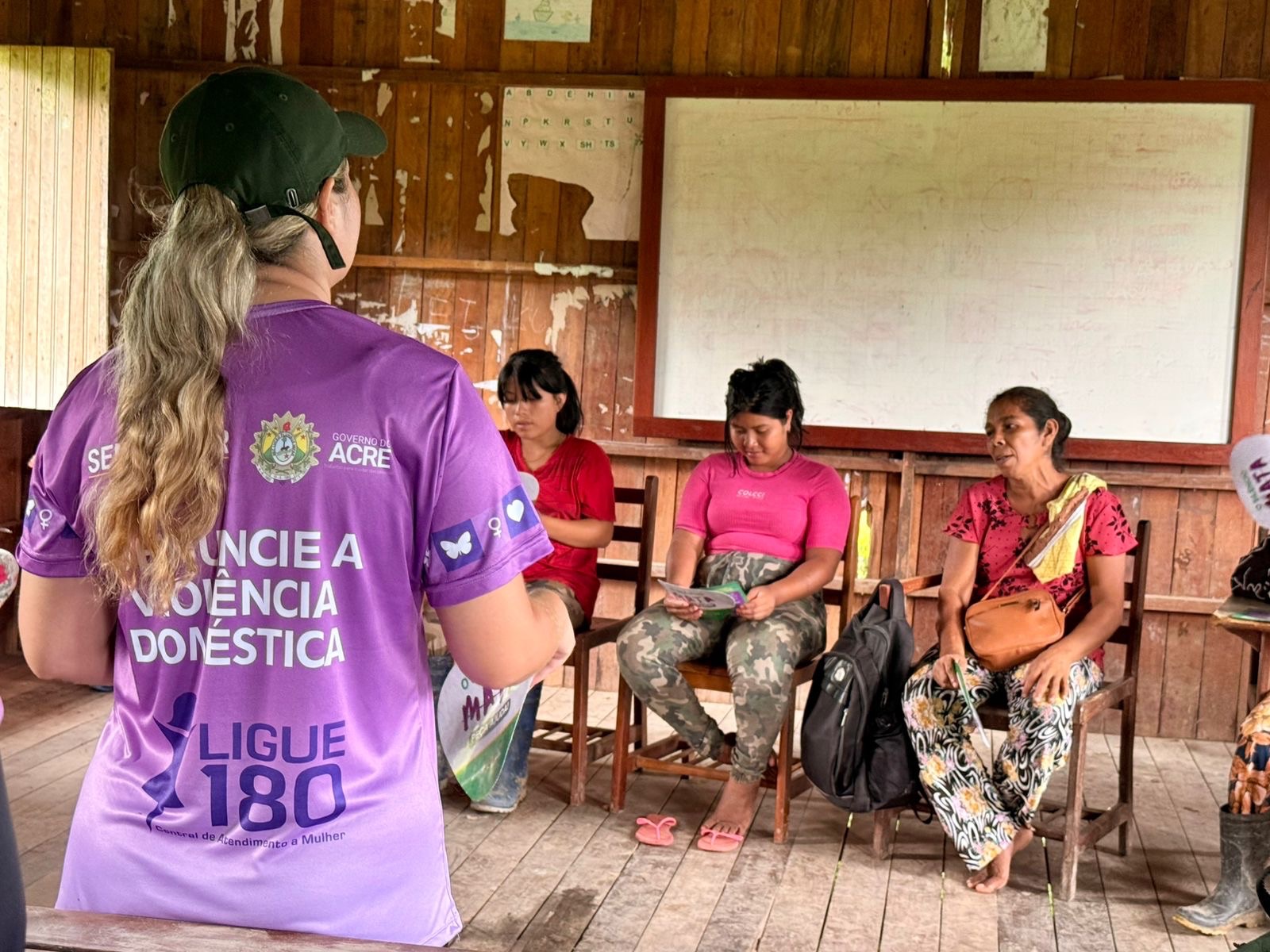 A Secretaria de Estado da Mulher (Semulher) realiza, ao longo desta semana, ação de atendimento e conscientização na Reserva Extrativista Cazumbá-Iracema, com o objetivo de orientar sobre a prevenção da violência contra a mulher. A iniciativa contempla mulheres indígenas e ribeirinhas que vivem na reserva, ampliando o acesso a informações e à rede de proteção. Até o momento, a equipe da secretaria já percorreu as aldeias Igarapé Preto, Buenos Aires, Extrema e Boca do Camarí, onde 32 mulheres foram beneficiadas com atendimentos e orientações por meio das atividades promovidas pela Semulher.