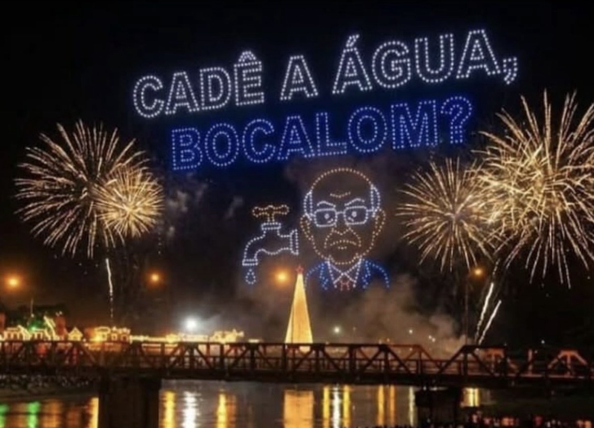 Show de drones no céu, torneiras secas no chão: montagem ironiza prioridades da gestão Bocalom